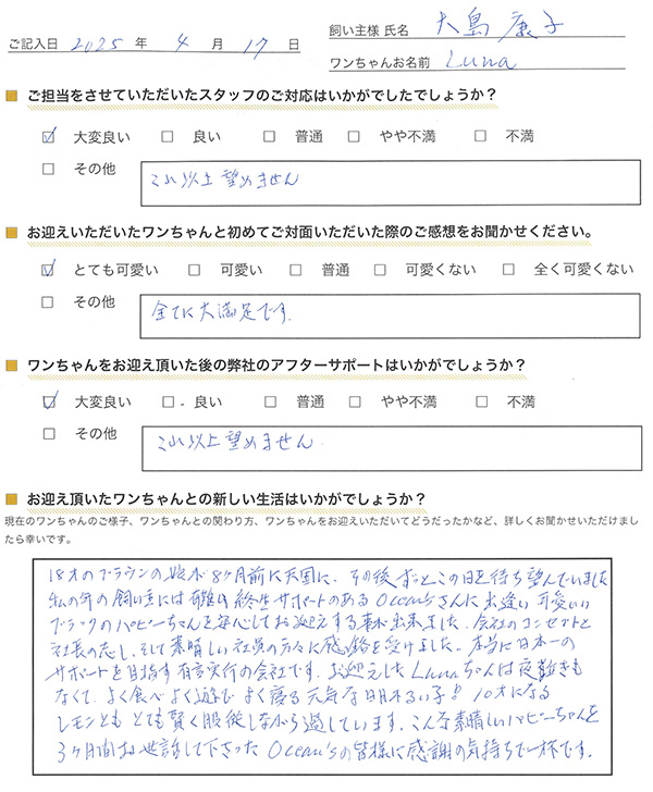 おめめクリクリブラックのルナちゃんをお迎えいただいた大島さまから、お喜びのお声です!