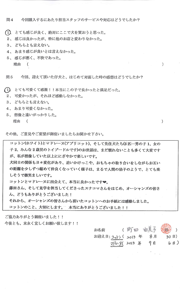 トイプードルをお迎え頂いたご感想。町田さまからのお手紙